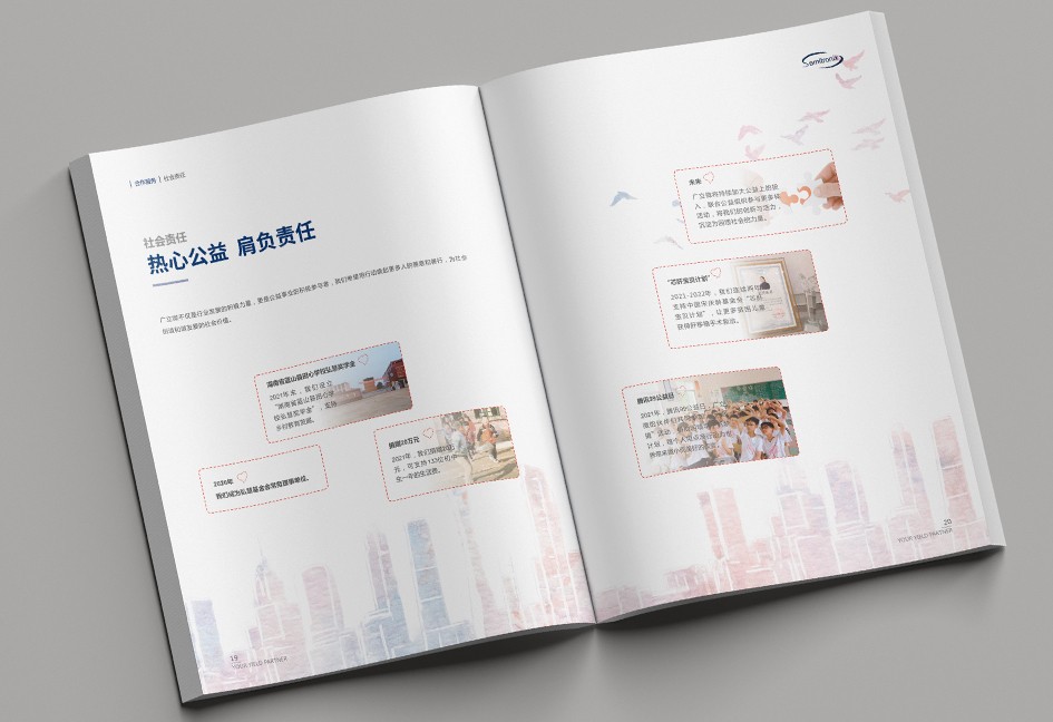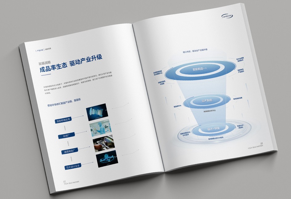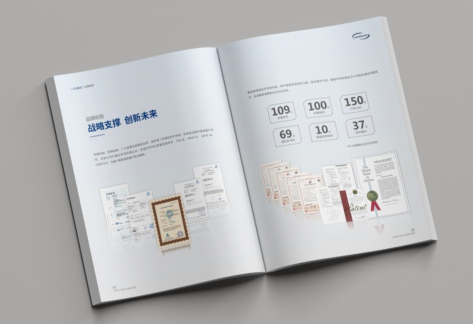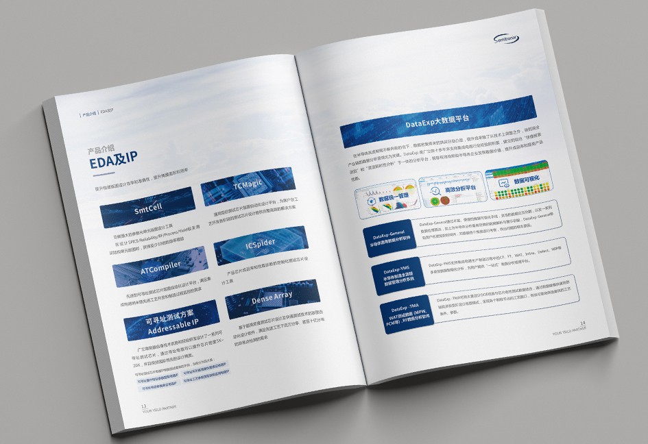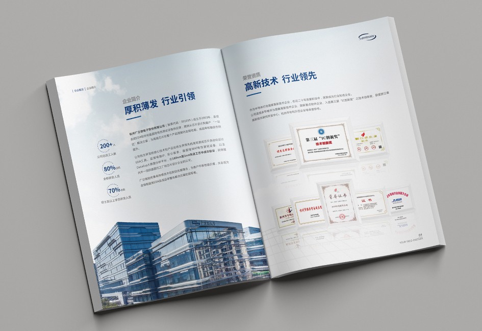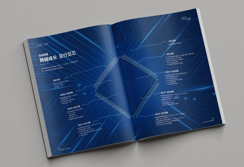 廣立微畫冊設計以“數之所指,芯之所向”為主題,分公司簡介、品牌優勢、公司歷程、產品路線、產品介紹、戰略發展、社會責任幾個單元依次展開,圖文并茂,簡潔大氣,科技感十足!