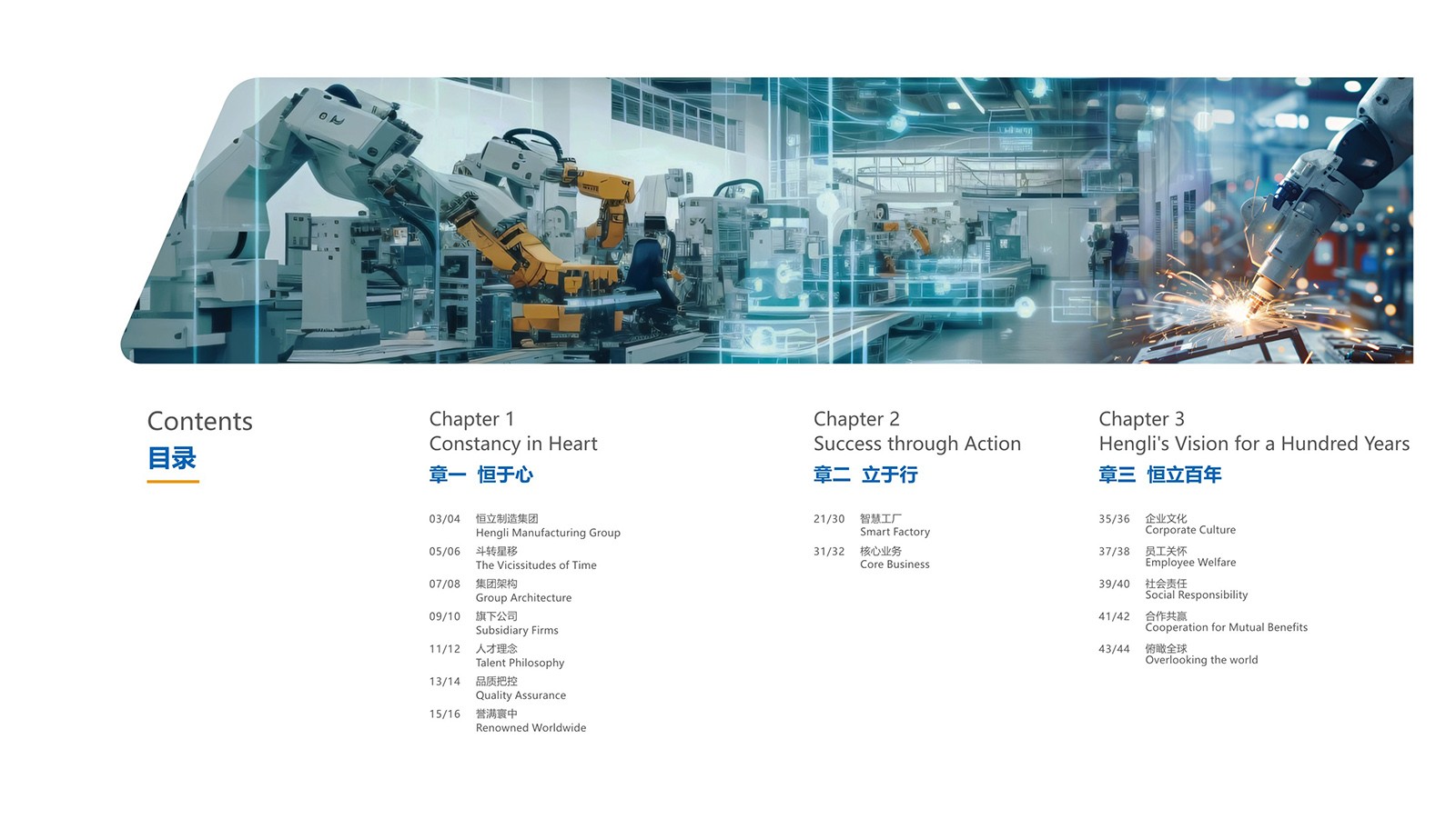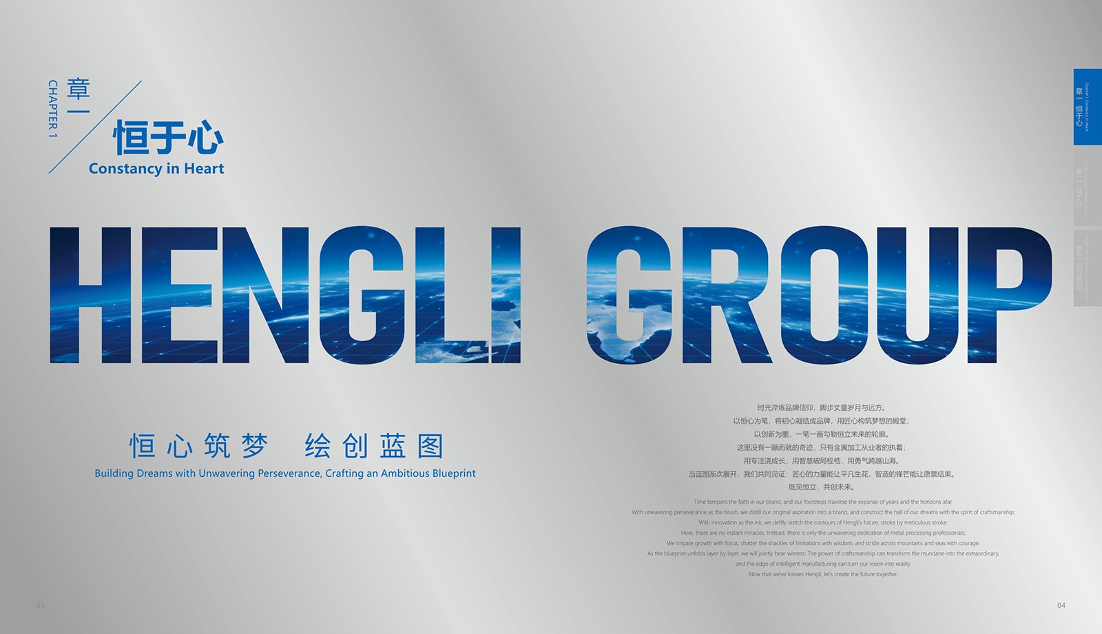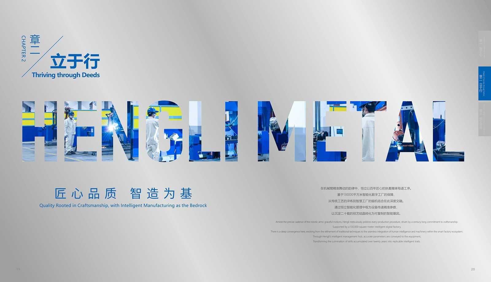 依據(jù)恒立的品牌色“恒立藍”為主色,加入印金和銀來體現(xiàn)金屬制造行業(yè)特色,采用科技感十足的設計,以科技藍與未來銀為主色調,搭配簡潔大氣的排版風格,使畫冊契合行業(yè)特點。